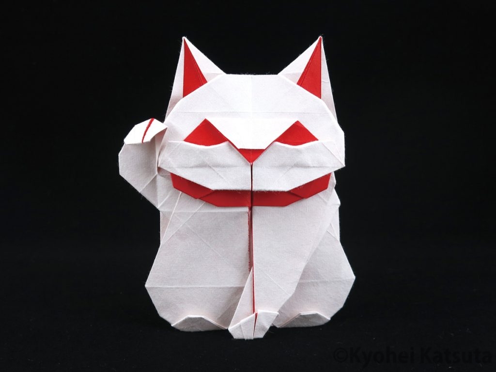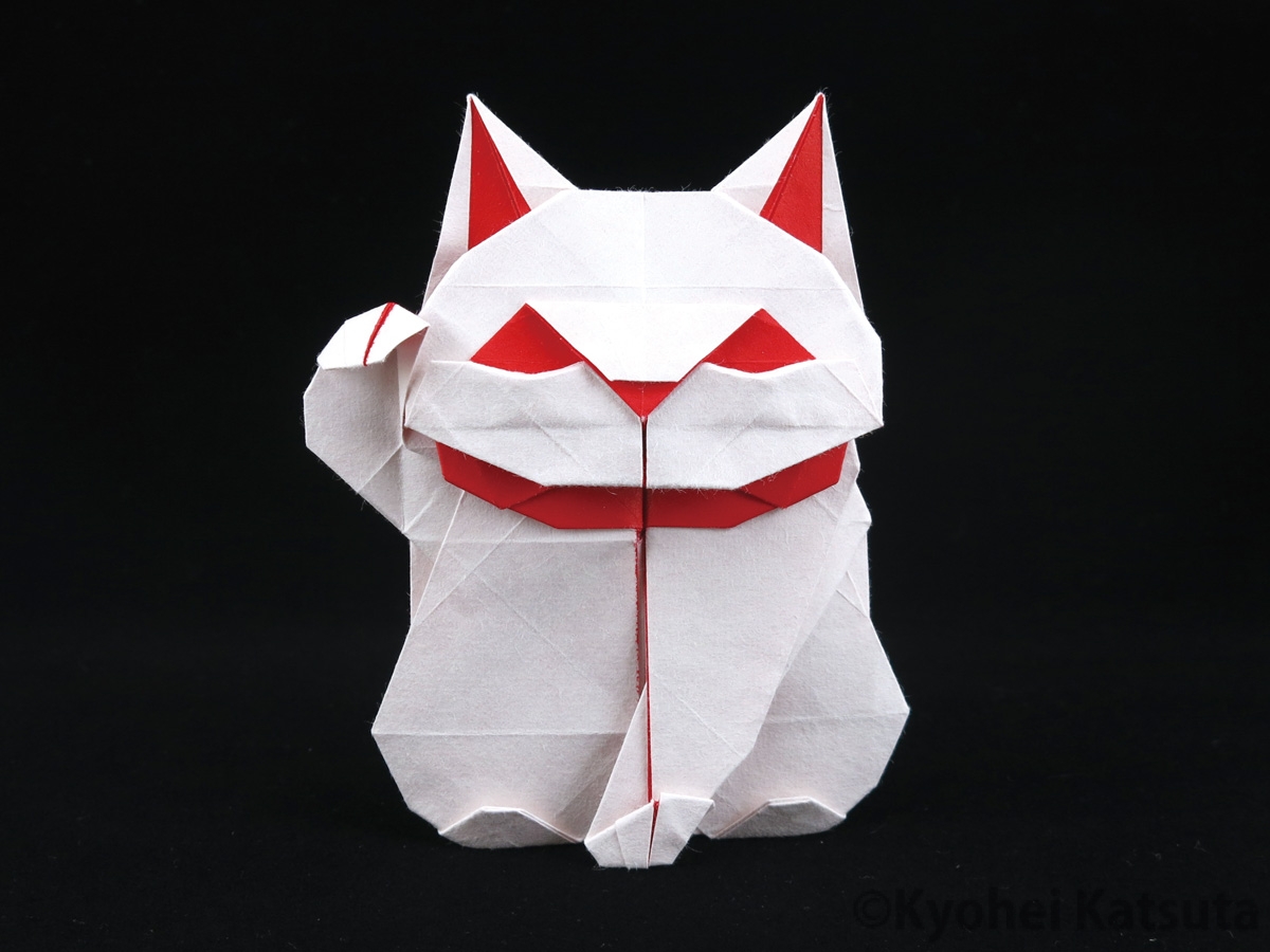 Maneki-neko/招き猫 uncut square paperDesigned : 2025/12Paper : 片面染奉書 30*30cm クオッカワラビーの片腕上げポーズから作れるのではないかと思ったけど、いじくっている内に原型がなくなった作品。